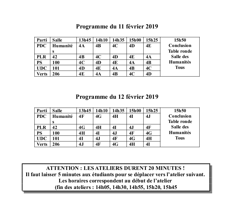 Dans cette perspective, la Direction du Collège et le groupe d'histoire proposent à tous les élèves de 4e année une rencontre avec les principaux partis politiques de notre canton. Les Jeunesses des différents partis (PDC, PLR, PS, UDC, Les Verts) auront ainsi l'occasion de rencontrer nos élèves à travers un atelier de 20 minutes chacun. Une table ronde conclura l'après-midi de présentation.