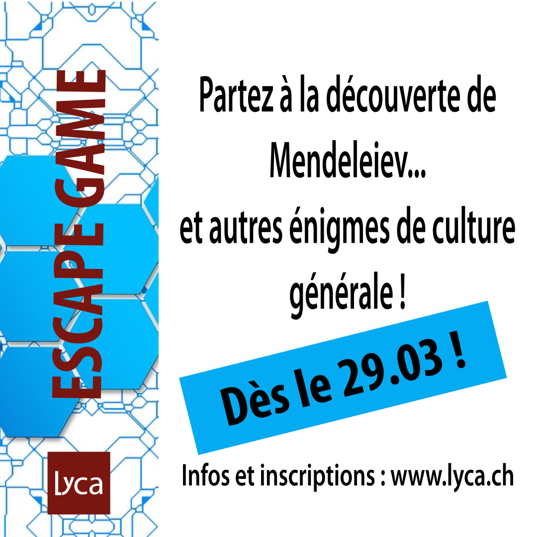 Deux escape rooms se trouvant à l’internat sont ouvertes autour du thème du tableau périodique : Mendeleïev a disparu mystérieusement et les éléments qu’il a découverts également. Tentez de tous les retrouver en 1h, sinon …