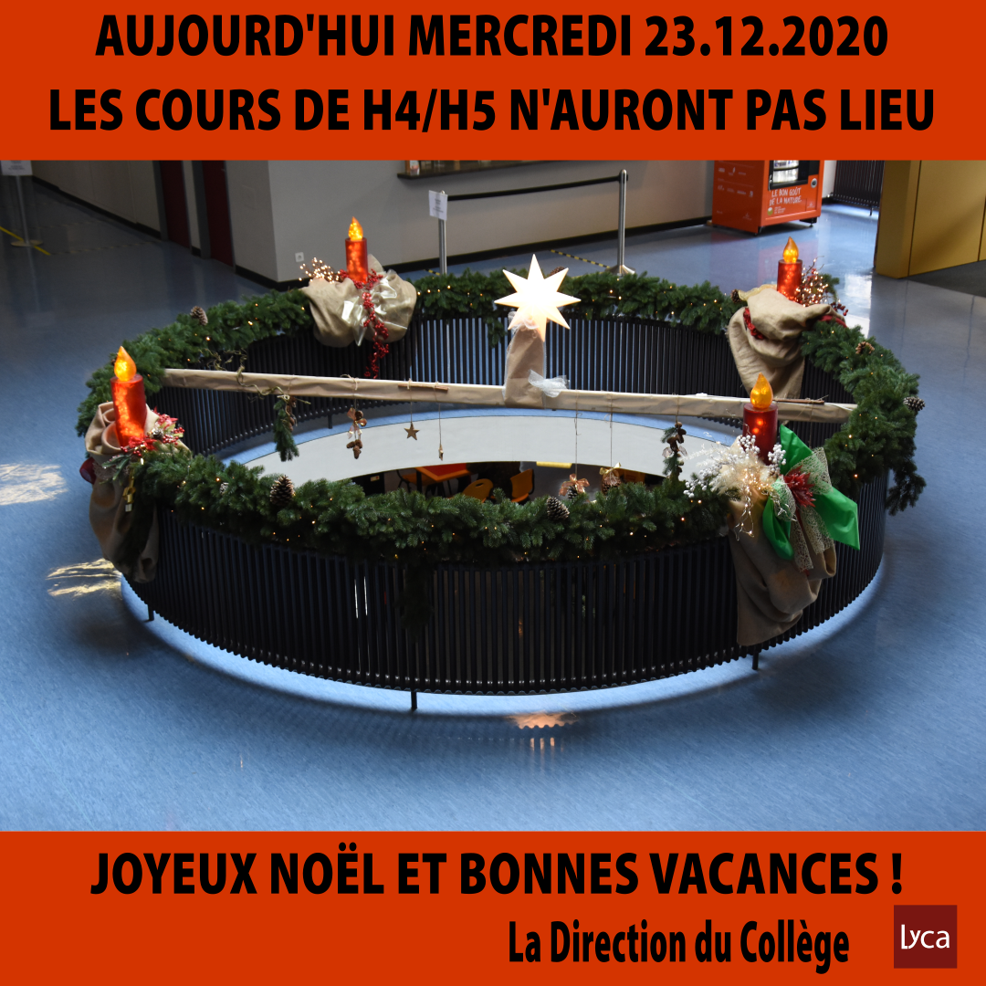 La Direction du Collège a décidé de marquer cette fête et cette fin de semestre en libérant des cours tous les élèves pour les heures H4/H5 ce mercredi 23 décembre 2020.