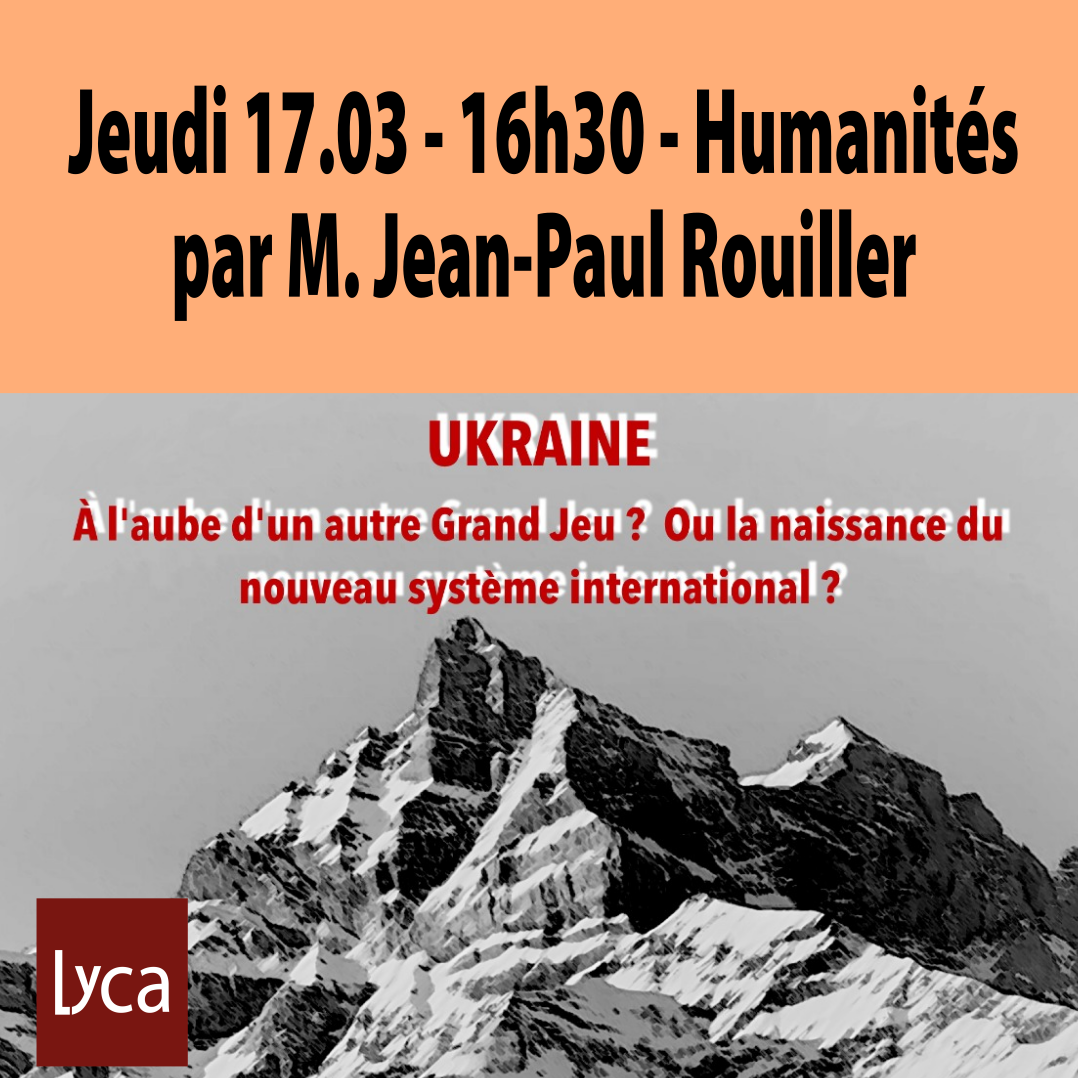 En ces temps de guerre, l'Aumônerie du Collège et l'Agaunia ont invité M. Jean-Paul Rouiller, spécialiste en relations internationales, à donner une conférence. La rencontre aura lieu le jeudi 17 mars 2022 à 16h30 à la salle des Humanités et le titre choisi est : "Ukraine : à l'aube d'un autre grand jeu, ou la naissance d'un nouveau système international."