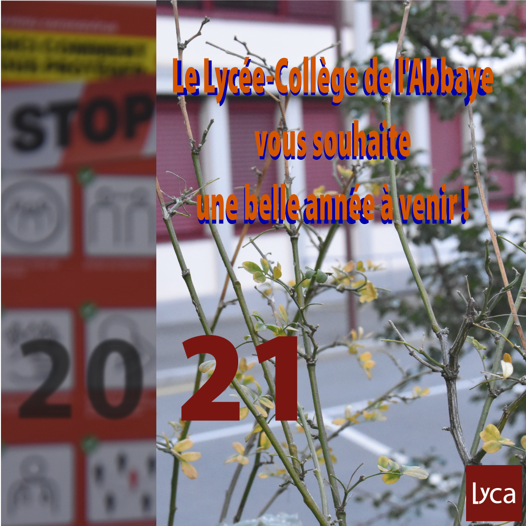 Recevez les meilleurs voeux du Lycée-Collège de l'Abbaye pour l'année 2021 ! Bonne fin de vacances et au plaisir de vous retrouver pour la reprise des cours le 7 janvier prochain. Prenez soin de vous !